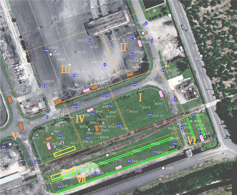 本場地土壤中乙苯(277mg/Kg)、二甲苯(766mg/Kg)、TPH (4,830mg/Kg)及地下水苯濃度(1.42mg/L)經改善後驗證結果已降為ND,並於2016年7月經環保局驗證通過解除列管。